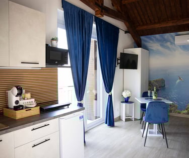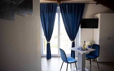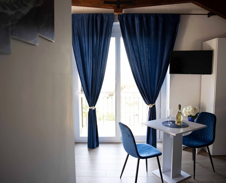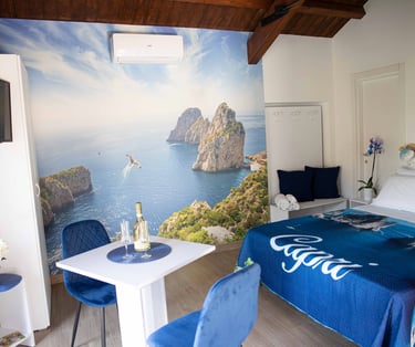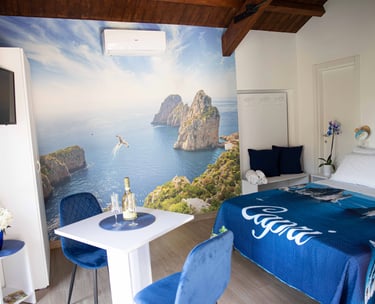 Una camera accogliente con tonalità blu, perfetta per rilassarsi dopo una giornata in Costiera Amalfitana.