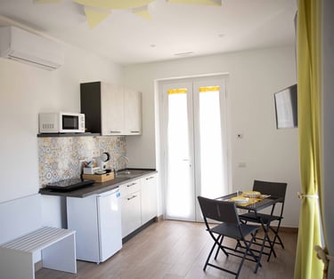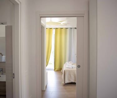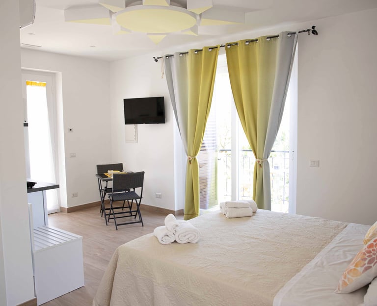 Una luminosa camera dai toni gialli, ispirata ai colori caldi del sole e dei limoni della Costiera Amalfitana.